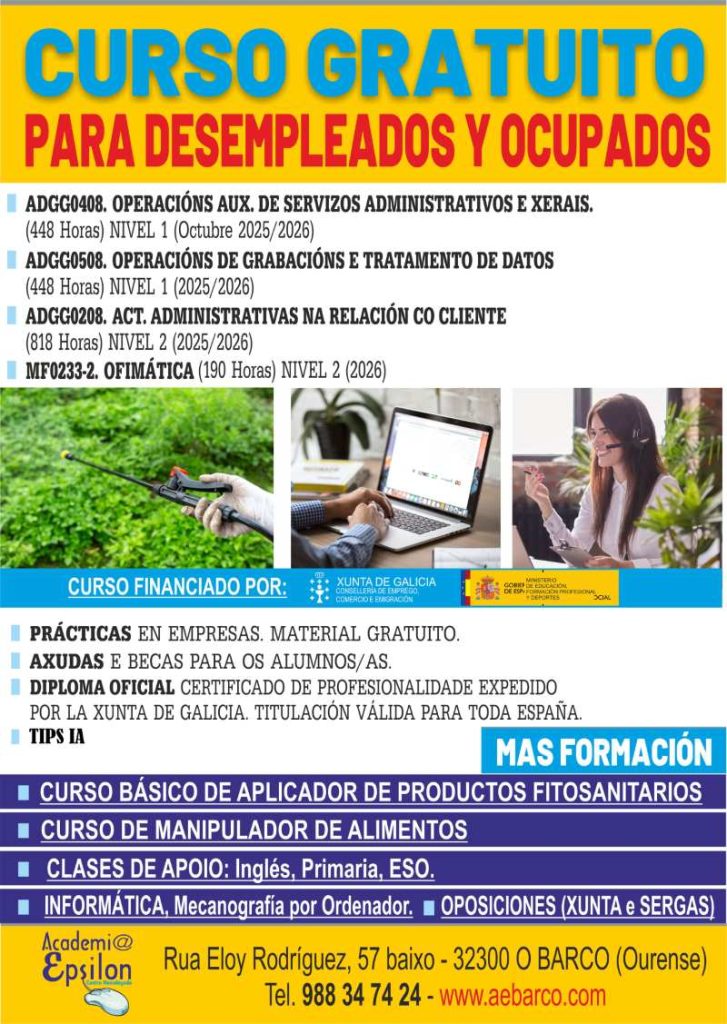 Academia Épsilon, situada en la calle Eloy Rodríguez Barrios, 57 de O Barco de Valdeorras, realiza una nueva oferta de cursos oficiales gratuitos, para personas desempleadas y ocupadas, que comenzarán a partir de octubre. El plazo para anotarse ya está abierto y basta con acercarse hasta Academia Épsilon o bien mandar un correo electrónico a info@aebarco.com