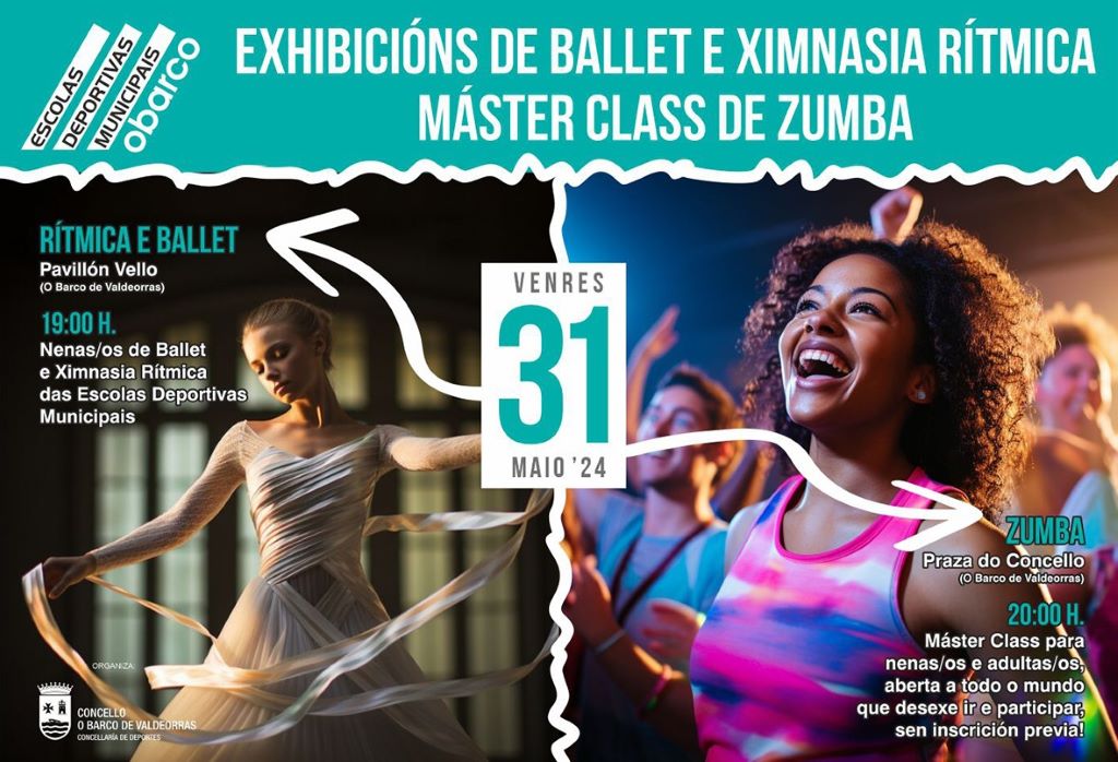 La concejalía de Deportes del Concello de O Barco de Valdeorras organiza para este viernes, 31 de mayo, una exhibición de ballet y gimnasia rítmica, a cargo de alumnas y alumnos de las Escuelas Deportivas Municipales, a partir de las 19,00 horas.