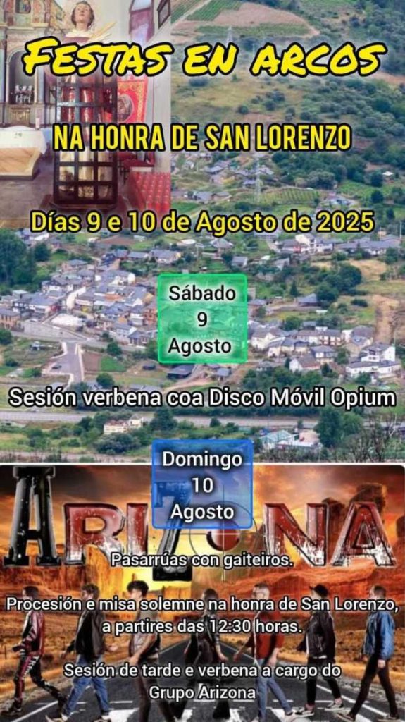 Arcos, localidad del municipio de Vilamartín de Valdeorras, celebra sus fiestas de San Lorenzo el 9 y 10 de agosto. La organización anima a sumarse a la celebración con una programación en la que la música será la tónica dominante.