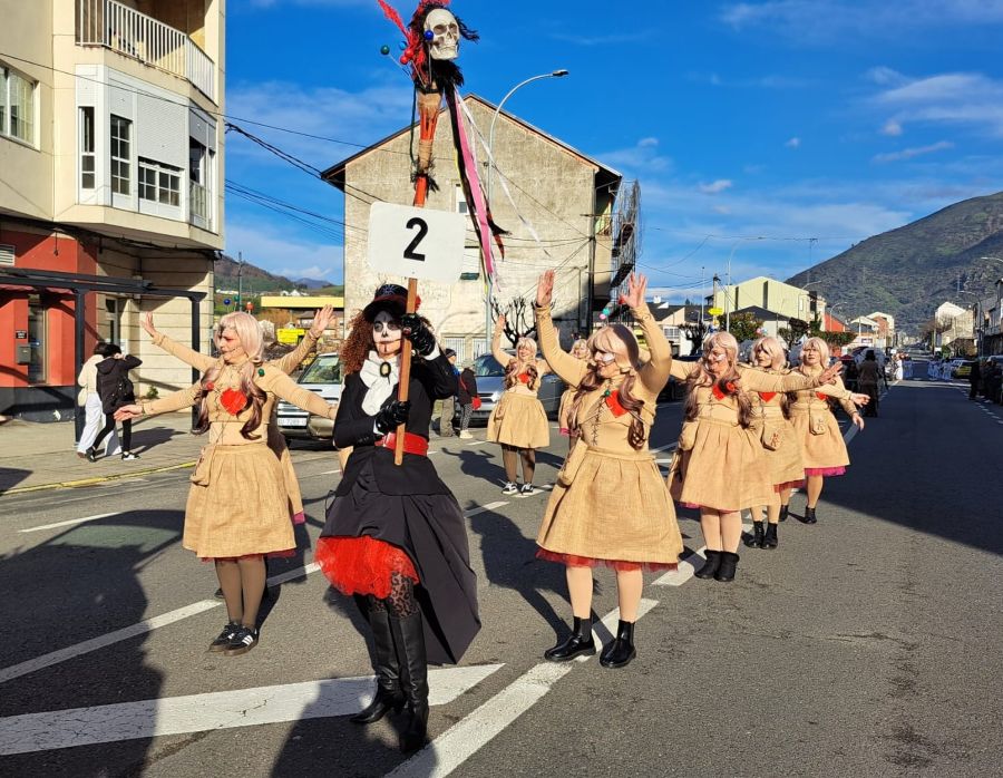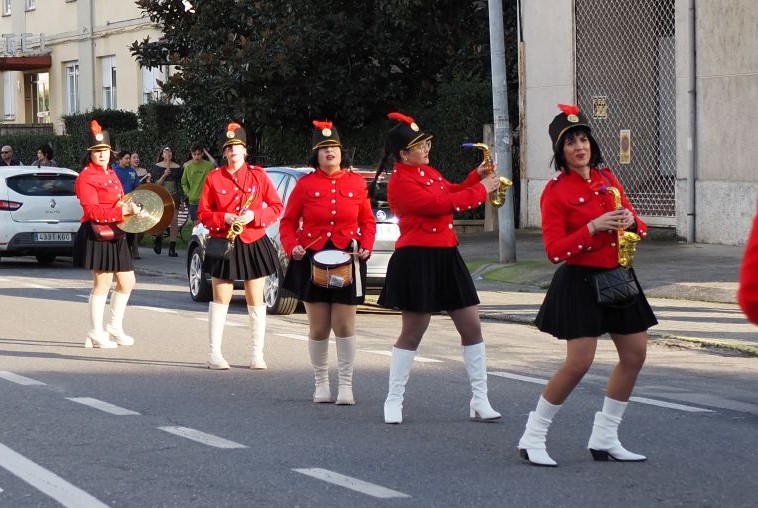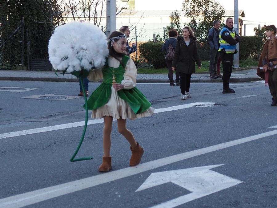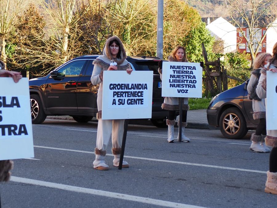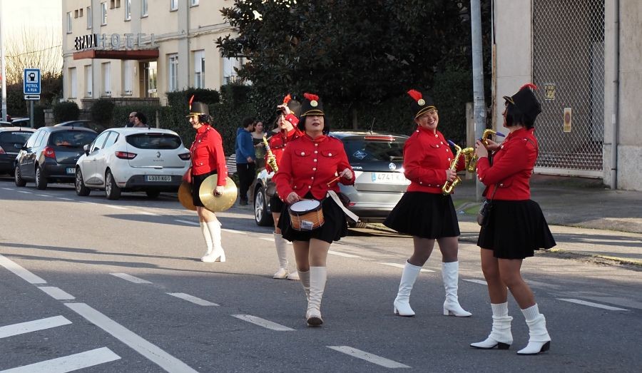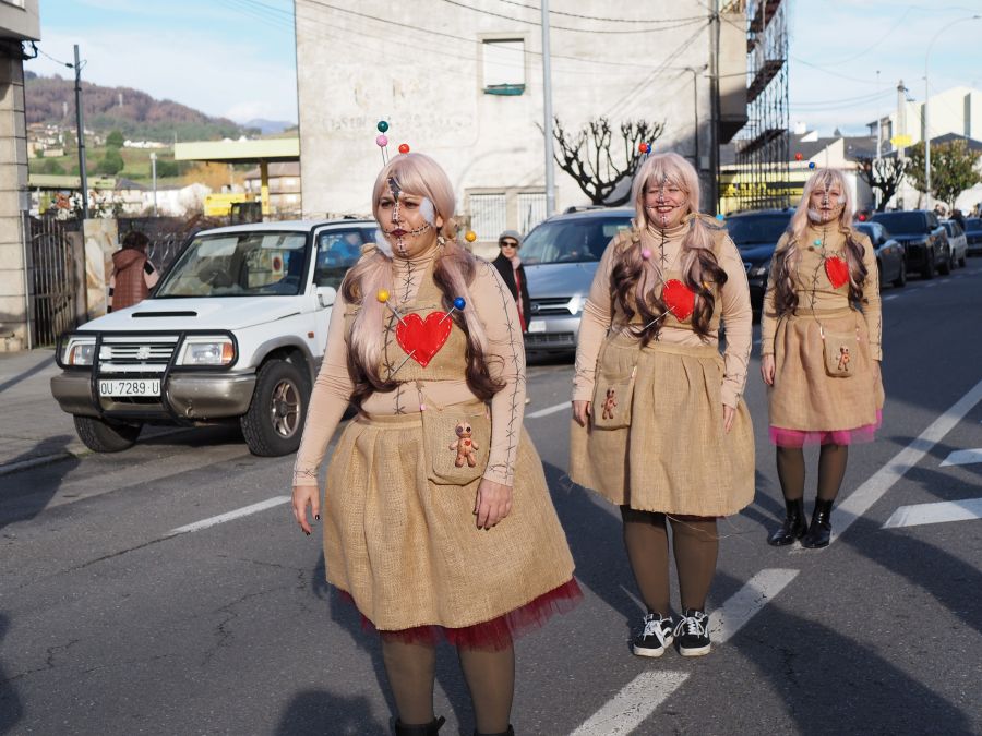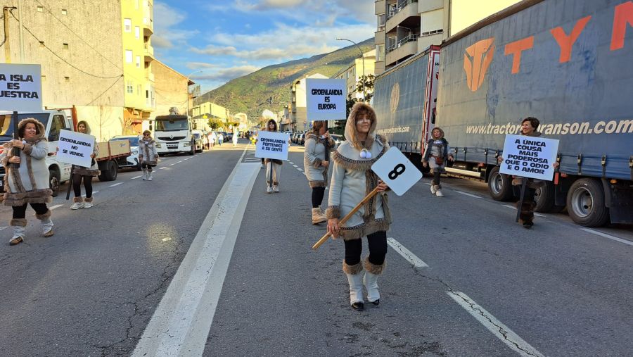 Majorettes de A Rúa interpretaron su música y baile, mientras que la comparsa de Petín encandiló con su dulce indumentaria, al tiempo que una comparsa de A Rúa escenificó la actualidad, concretamente el conflicto de Groenlandia, y no faltaron las «muñecas vudjú».