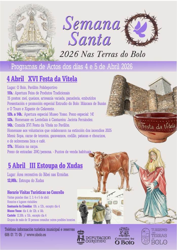 O Bolo seguirá recuperando tradicións e elementos tradicionais da súa rica cultura etnográfica dentro da programación de Semana Santa. Neste concello de montaña xa é tradición rematar a semana de Pasión coa tradicional festa e feira da Vitela que será este ano o sábado, 4 de abril. É unhas actividades basadas na exaltación dos produtos tradicionais deste concello. Ademais, o domingo, día 5 de abril, se fará a III Estoupa do Xudas.