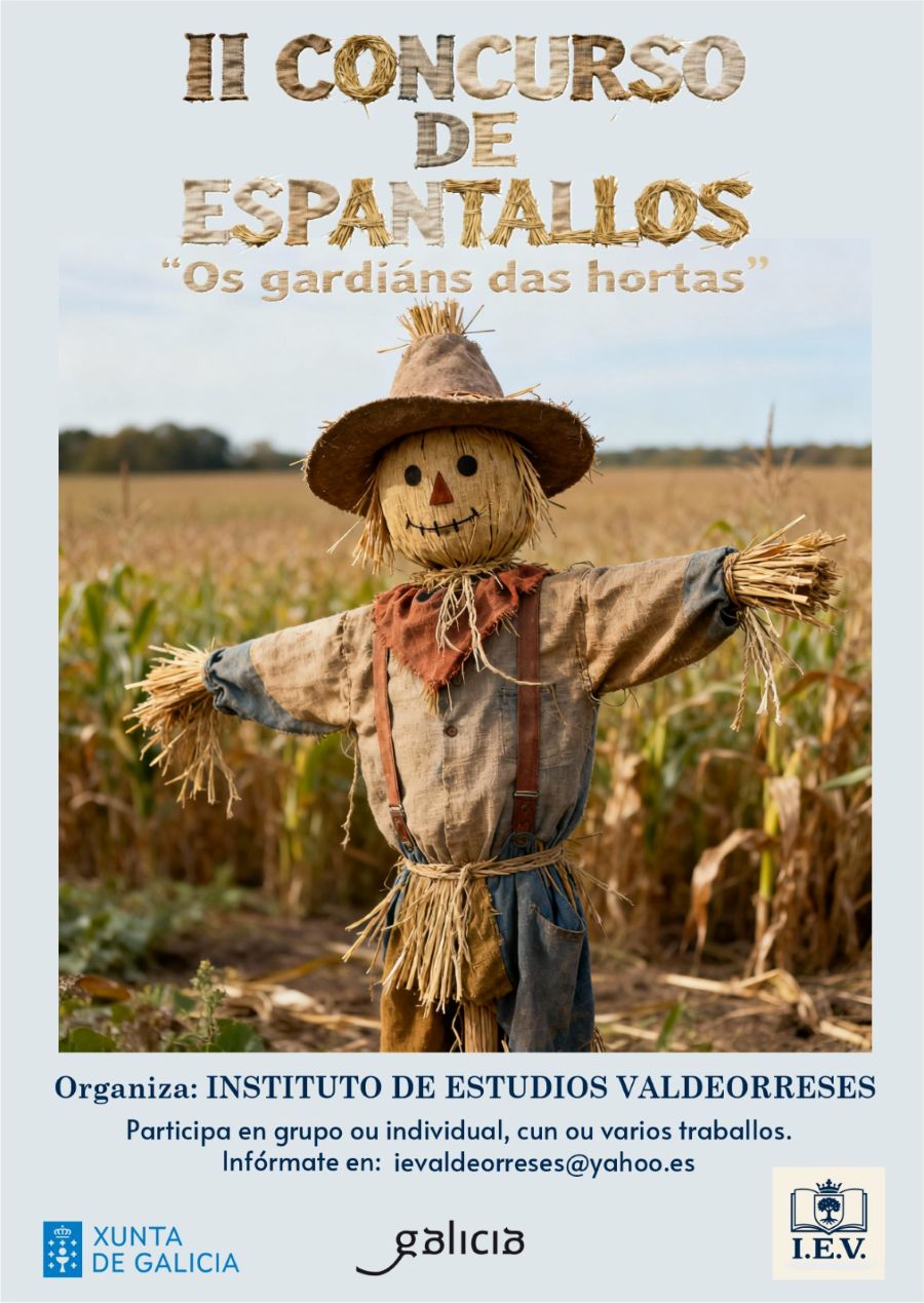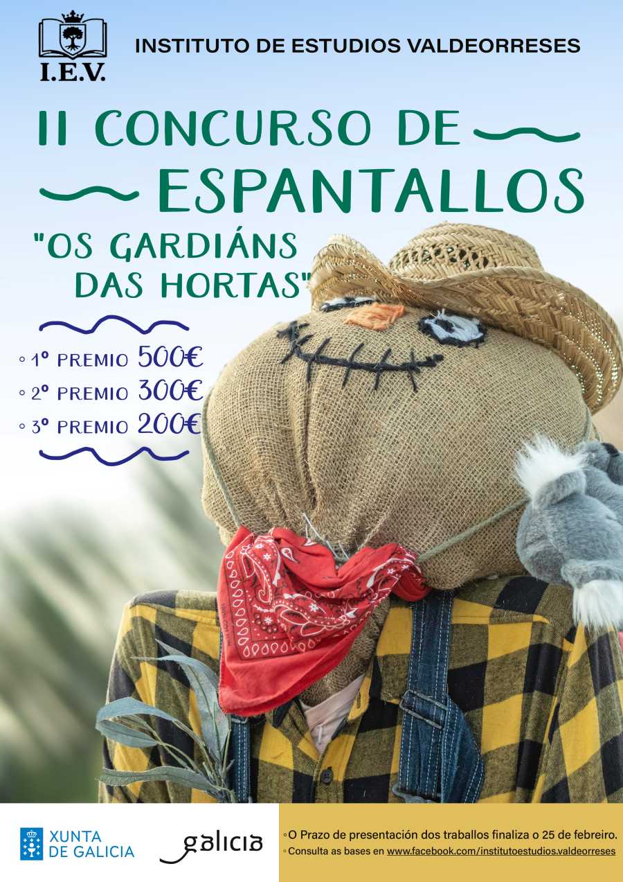 O Instituto de Estudios Valdeorreses presentou esta mañá a segunda edición do seu «Concurso de espantallos», baixo o lema de «Os gardiáns das hortas». Con esta iniciativa, como manifestou o presidente do IEV, Aurelio Blanco Trincado, «preténdese poñer en valor unha figura fundamental do rural galego, que podemos ver ao longo da nosa xeografía en calquera horta ou explotación agrícola. Un elemento que en moitas ocasións nos sorprende pola gran orixinalidade coa que os seus autores a decoran. Tanto os particulares coma os profesionais».