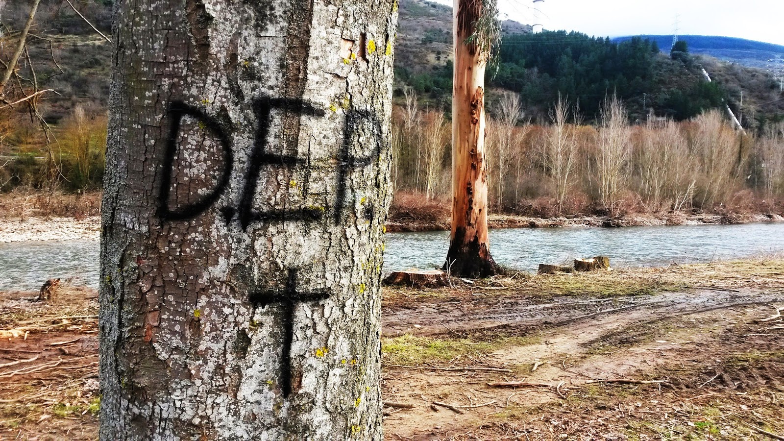 En las últimas horas el paraje de A Reza, en A Rúa, recibió la visita de vecinos y curiosos que se aproximaron hasta este entorno del río Sil para comprobar con sus propios ojos como la tala indiscriminada de más de 65 árboles aniquiló este espacio verde situado a orillas del Sil. En uno de los árboles apareció una pintada con una cruz y las inconfundibles siglas fúnebres: DEP.
