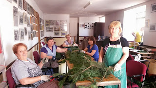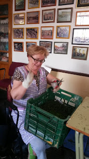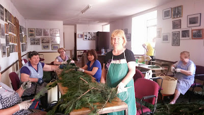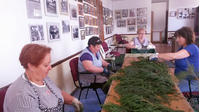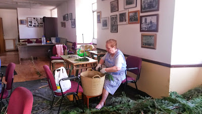 Mujeres de A Rúa Vella dedican más de cuatro horas diarias durante todo el mes de mayo a desmenuzar tuya para la próxima elaboración de las alfombras florales que sembrarán el corazón de la localidad el próximo 7 de junio con motivo del Corpus.
