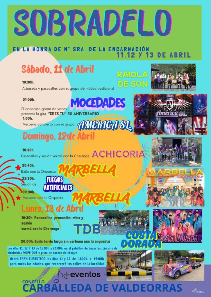 Las fiestas de La Encarnación de Sobradelo arrancarán el sábado 11 de abril con la tradicional alborada y pasacalles a cargo de Raiola de Son. Por la noche, a las 21:00 horas, llegará uno de los momentos más esperados con el concierto de Mocedades, seguido de verbena con el grupo América SL.