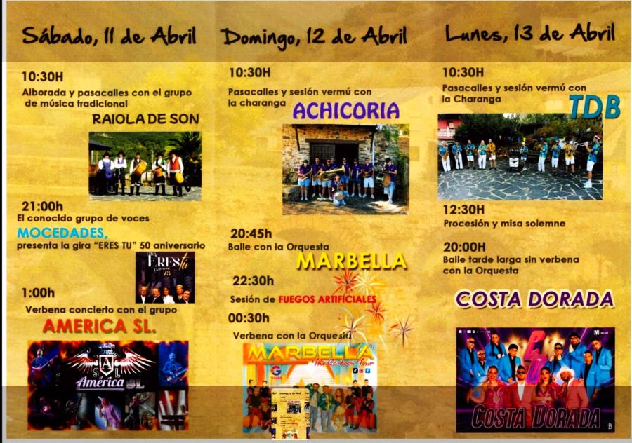 El domingo 12 de abril continuará la programación con pasacalles y sesión vermú con la charanga Achicoria. Ya por la noche, la orquesta Marbella amenizará la jornada con baile, que incluirá además una sesión de fuegos artificiales y una segunda verbena de madrugada.