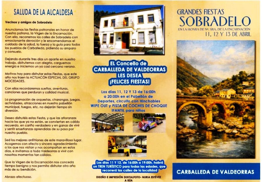 Sobradelo (Carballeda de Valdeorras) ya tiene todo preparado para sus fiestas patronales en honor a La Encarnación, que tendrán lugar los días 11, 12 y 13 de abril. Son las primeras que marcan el calendario festivo en Valdeorras, con un completo programa de actividades musicales y festivas pensado para todos los públicos. La alcaldesa, María del Carmen González, ha dado a conocer la programación organizada «con mucho cariño» —dice— por el Concello con una gran sorpresa, un concierto del Xacobeo: la actuación del mítico grupo Mocedades, que inicia aquí su gira «Eres tú» con motivo de su 50 aniversario.