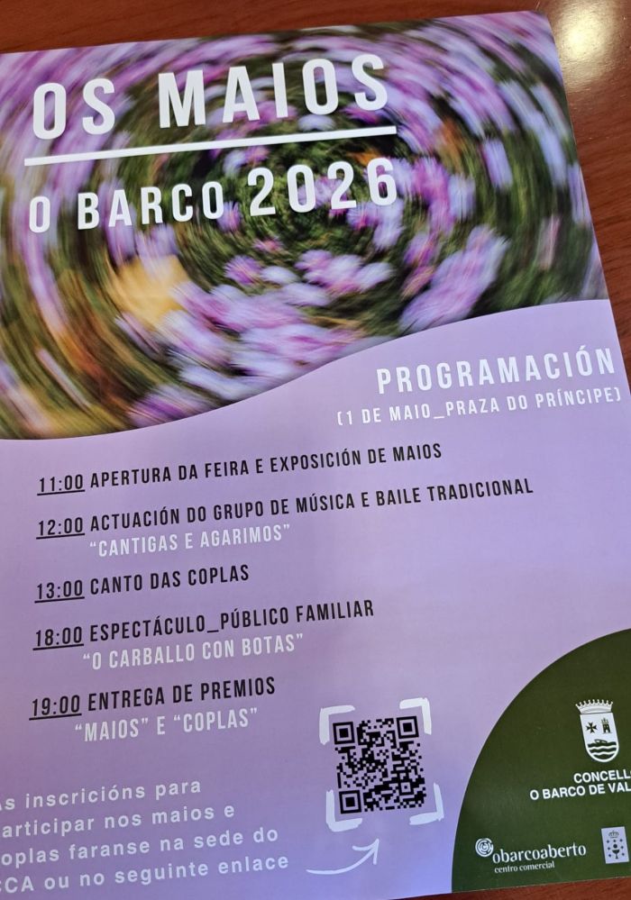 A concelleira de Cultura do Concello do Barco, Margarida Pizcueta, presentou os Maios, que se festexarán o 1 de Maio, unha tradición que —dixo— sigue moi viva e que se conserva en poucas localidades de Galicia. De feito, «o próximo ano gustaríanos recuperar o maio humano, figura que existía no pasado». A celebración repartirá máis de 2.300 euros en premios e o prazo de inscripción está aberto, ata o xoves 29 de abril, para participar.