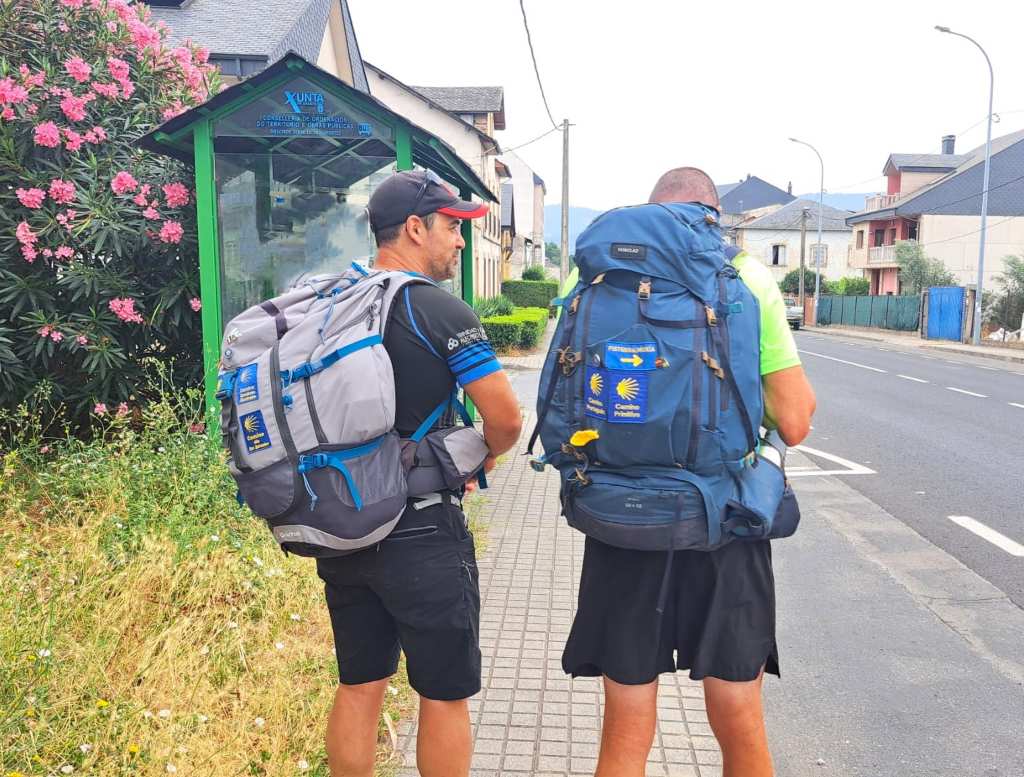 Juan Francisco Mora, de Yecla (Murcia), y Davide (de la ciudad italiana de Bérgamo) son peregrinos que recorren el Camino de Invierno, en plena ola de calor y, ahora, sorprendidos con el retablo de fondo de los incendios, que se han topado al llegar a El Bierzo. El paisaje —expresan— «resulta desolador» generando tristeza e impotencia.