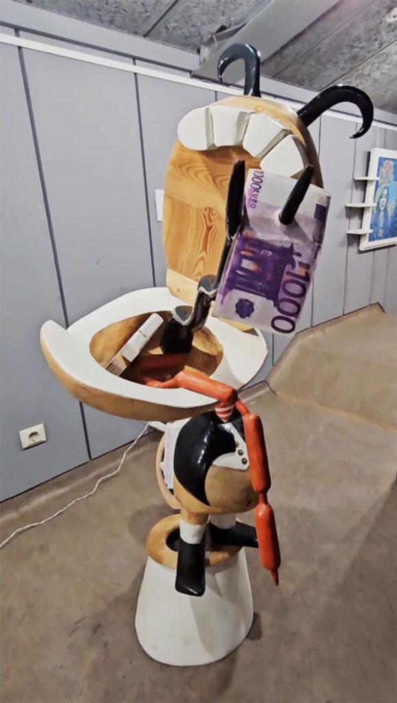 Además de la ya de por si laboriosa y detallista construcción de las piezas de Piquico, reconocida una vez más en esta exposición, hay que sumarle otros factores «que complican y mucho la elaboración de todas y cada una de las figuras que la conforman», valora Piquico: La interpretación de cada uno de los personajes reales del Entroido, la inclusión de la funcionalidad como mobiliario que es y el hecho de ser desmontables para su traslado pues son piezas con partes muy delicadas».