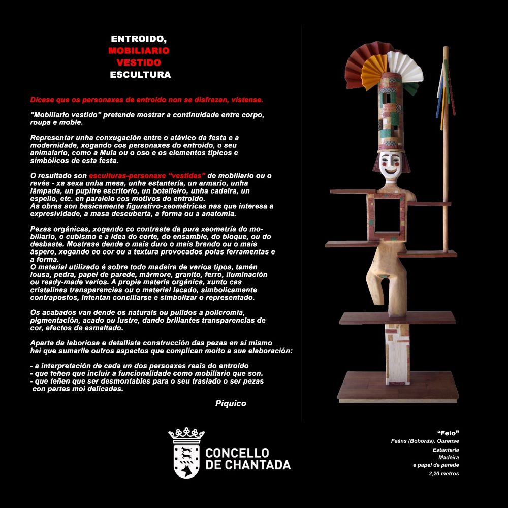 El Entroido de Piquico se recrea ahora en Chantada. Sus esculturas-mueble toman vida en la Casa de Cultura de esta localidad lucense. En cada sala, cobran nuevas perspectivas, movimiento y significado, con el concepto propio como telón de fondo, que cada espectador modela, expande o interpreta a su antojo.