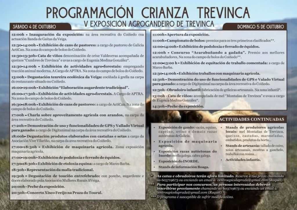 La V Exposición Agrogandeira Crianza Trevinca será este fin de semana, 4 y 5 de octubre, organizada por el Concello de A Veiga y el Inorde. La feria por excelencia que pone en valor la la labor de ganaderos, agricultores y artesanos, que apuesta por la vida en el rural, será inaugurada el sábado a las 12,00 horas del mediodía en la playa fluvial «O Coiñedo» abriendo un programa que fusiona la tradición, formación, gastronomía, juegos populares y música.