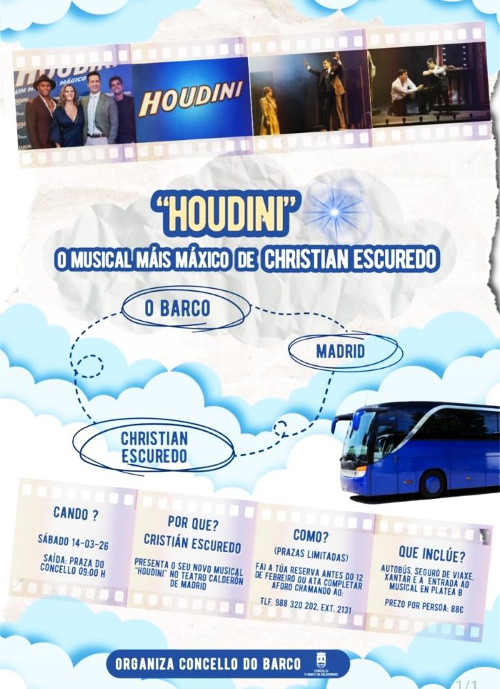 La concejalía de Cultura del Ayuntamiento del O Barco organiza un viaje a Madrid para asistir, en el Teatro Calderón, a la obra «Houdini, un musical mágico», en el que el barquense Christian Escuredo tiene un papel destacado. Será el 14 de marzo.